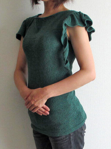 元パターンは、身頃を三日月型に斜めに編むことでウエストにドレープが入る、アシンメトリーの美しいデザイン。袖のバリエーションで6種類の仕上がりを選べます。